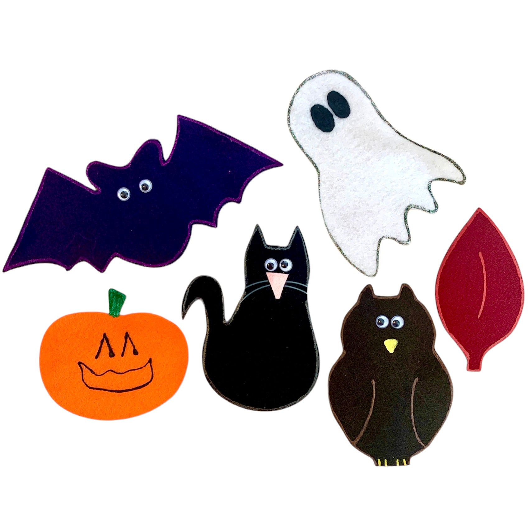 (Chat noir, fantôme blanc, chauve-souris violette, chouette brune, feuille rouge et citrouille orange !)