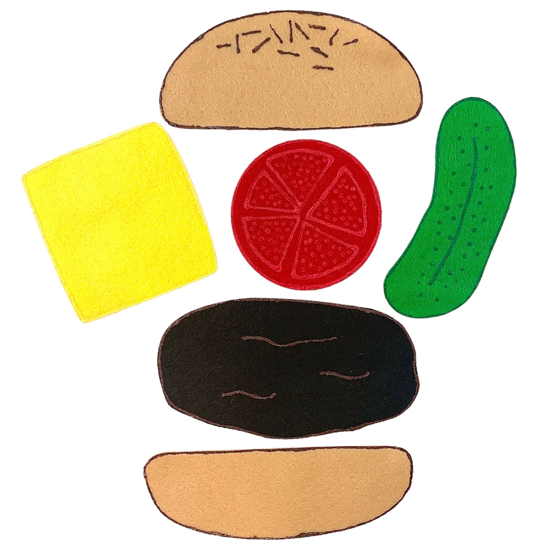 (Comprend le haut et le bas d'un pain à hamburger, une tranche de fromage, un cornichon, une tomate et une galette de hamburger !)