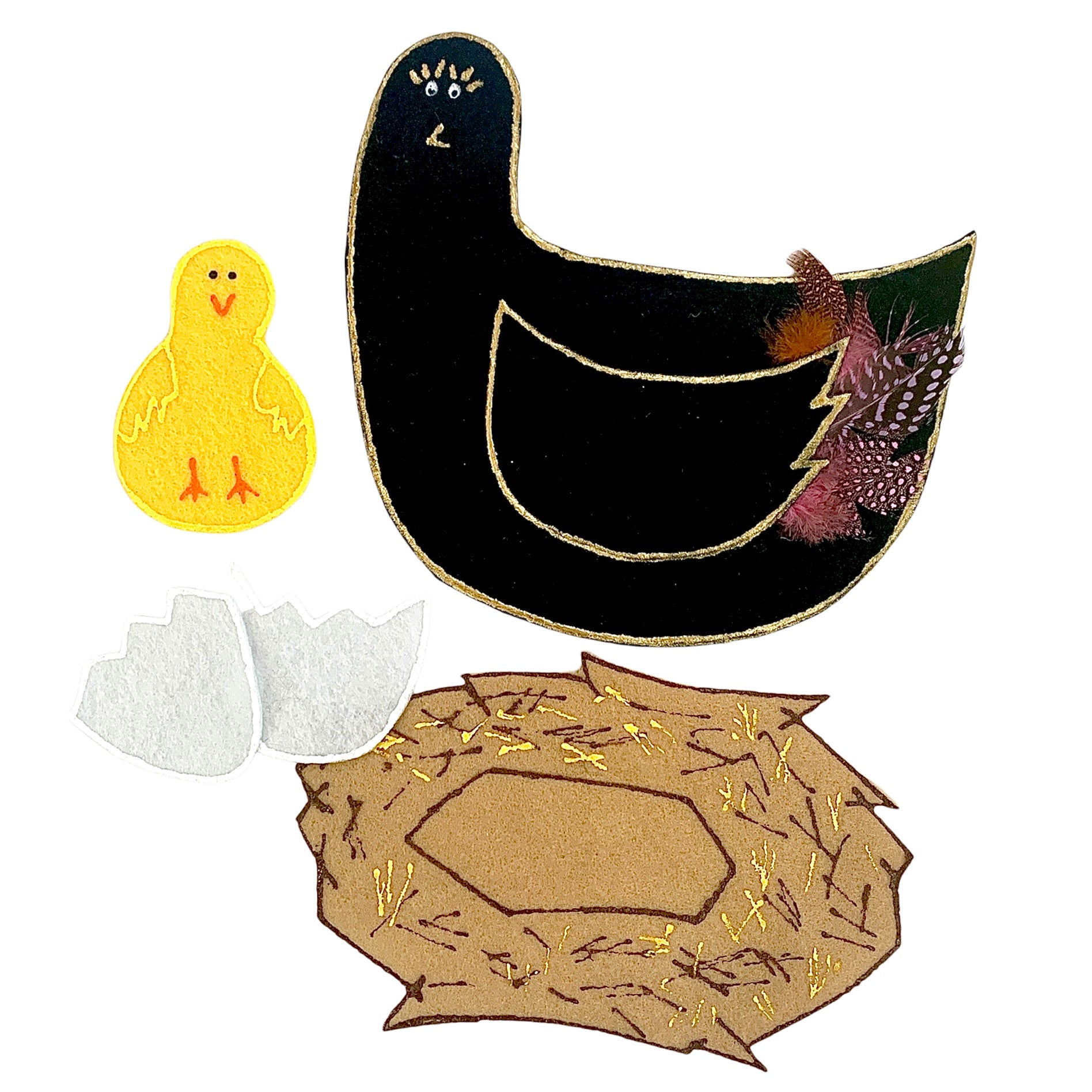 Comprend : maman poule, poussin, œuf cassé et nid.