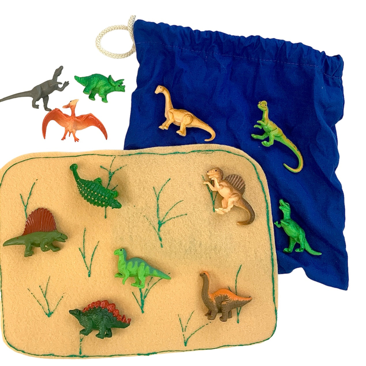 Le kit comprend un assortiment de huit dinosaures et un tapis de jeu en feutre, tous conservés ensemble dans un sac à cordon.