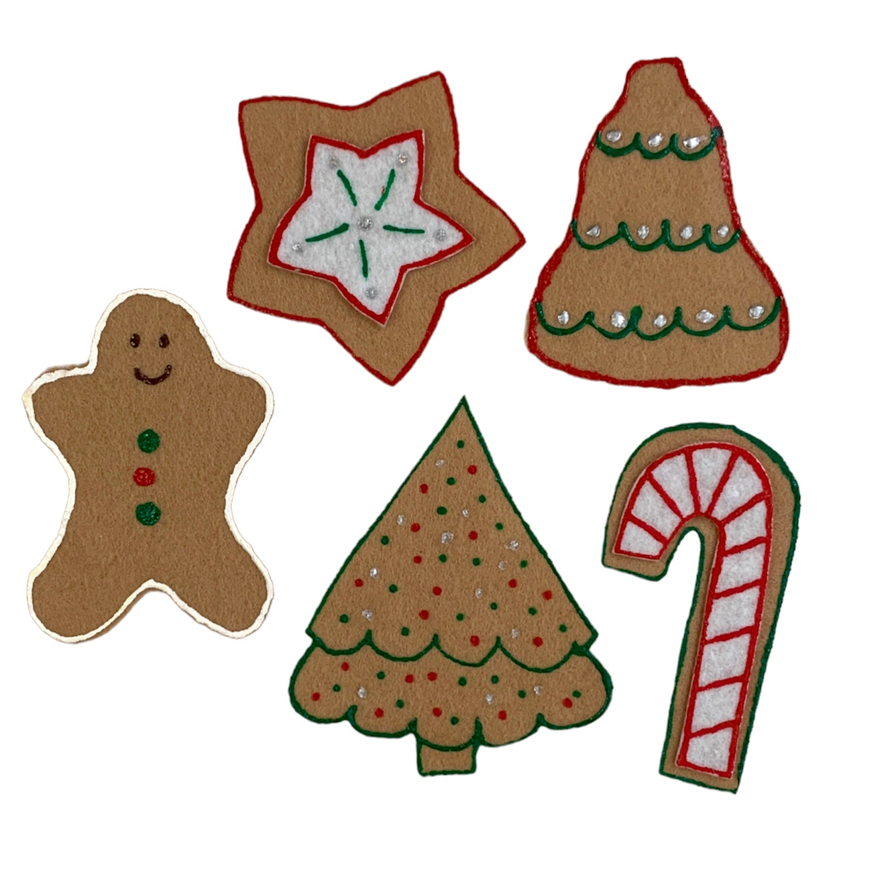 (Comprend cinq biscuits de Noël décorés différents : arbre, canne en bonbon, étoile, cloche et bonhomme en pain d'épice.)