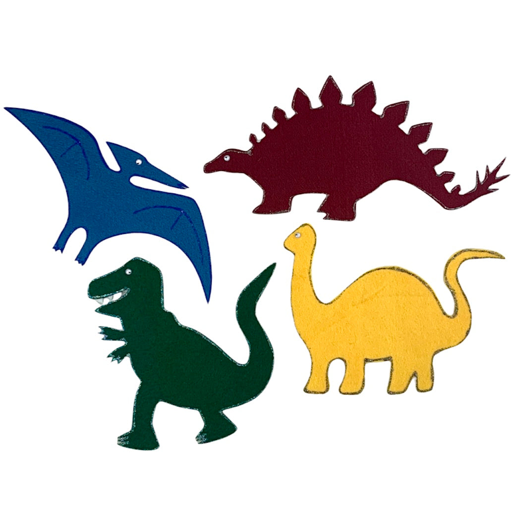 (Comprend quatre dinosaures colorés : un ptérodactyle, un tyrannosaure rex, un brontosaure et un stégosaure.)