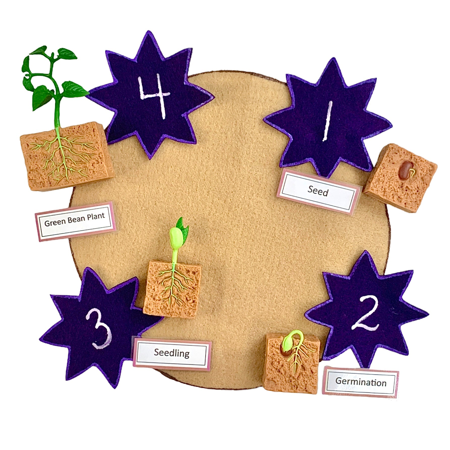 Le kit comprend des figurines de papillons de haute qualité représentant une graine, une germination, un semis, un haricot vert, les numéros 1 à 4 sur feutre, un tapis de jeu circulaire, des étiquettes plastifiées de chacune des étapes et un sac à cordon pour ranger le tout !