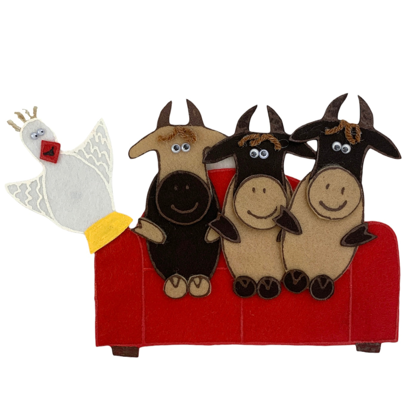 (Comprend un canapé rouge, un oiseau blanc et trois vaches folles.)