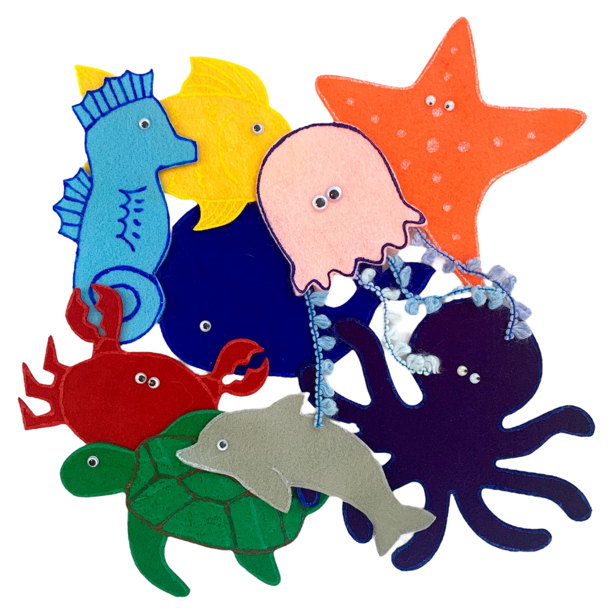 (Comprend neuf créatures marines en feutre : poisson, hippocampe, étoile de mer, baleine, méduse, poulpe, crabe, dauphin et tortue.)