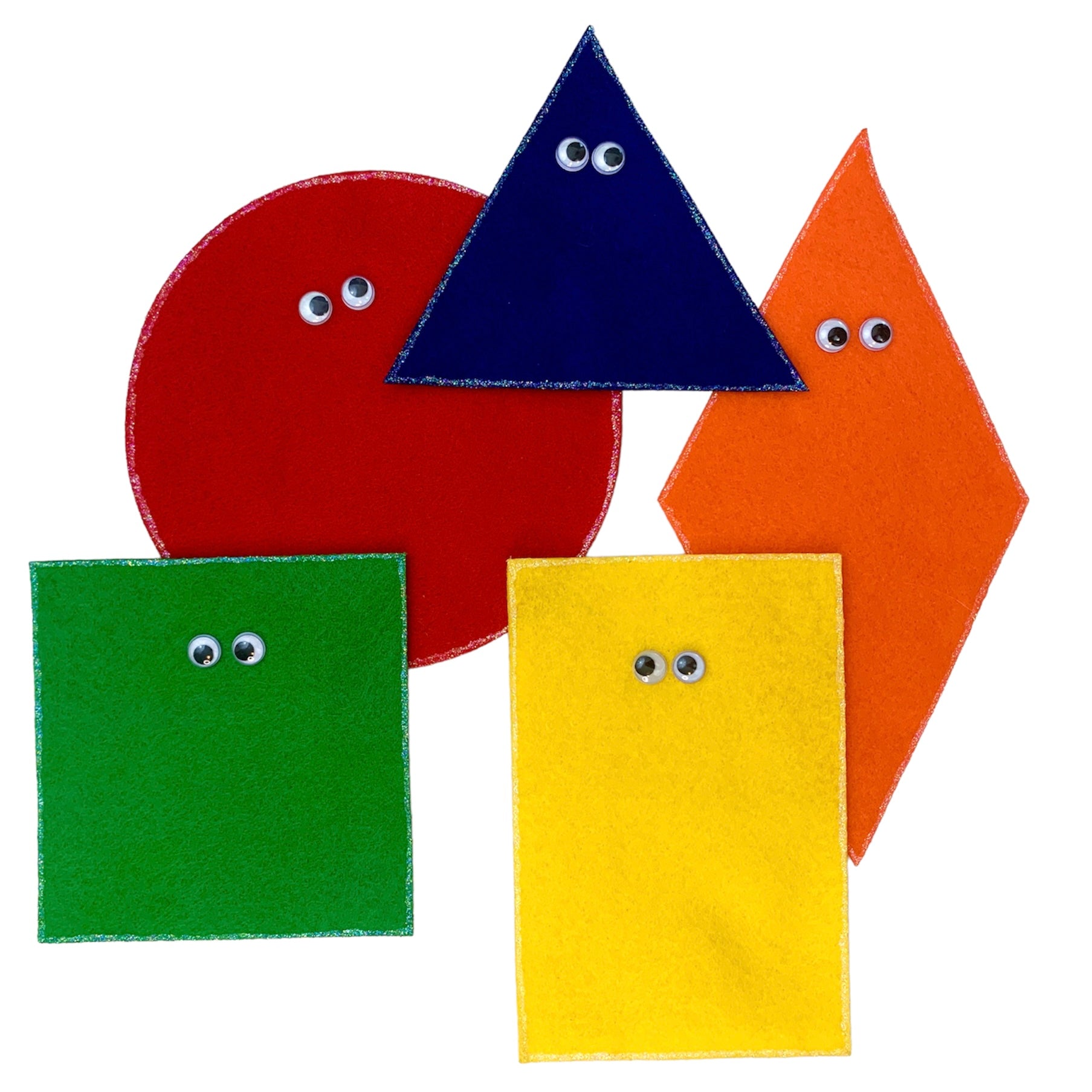 (Comprend un cercle rouge, un triangle bleu, un losange orange, un rectangle jaune et un carré vert.)