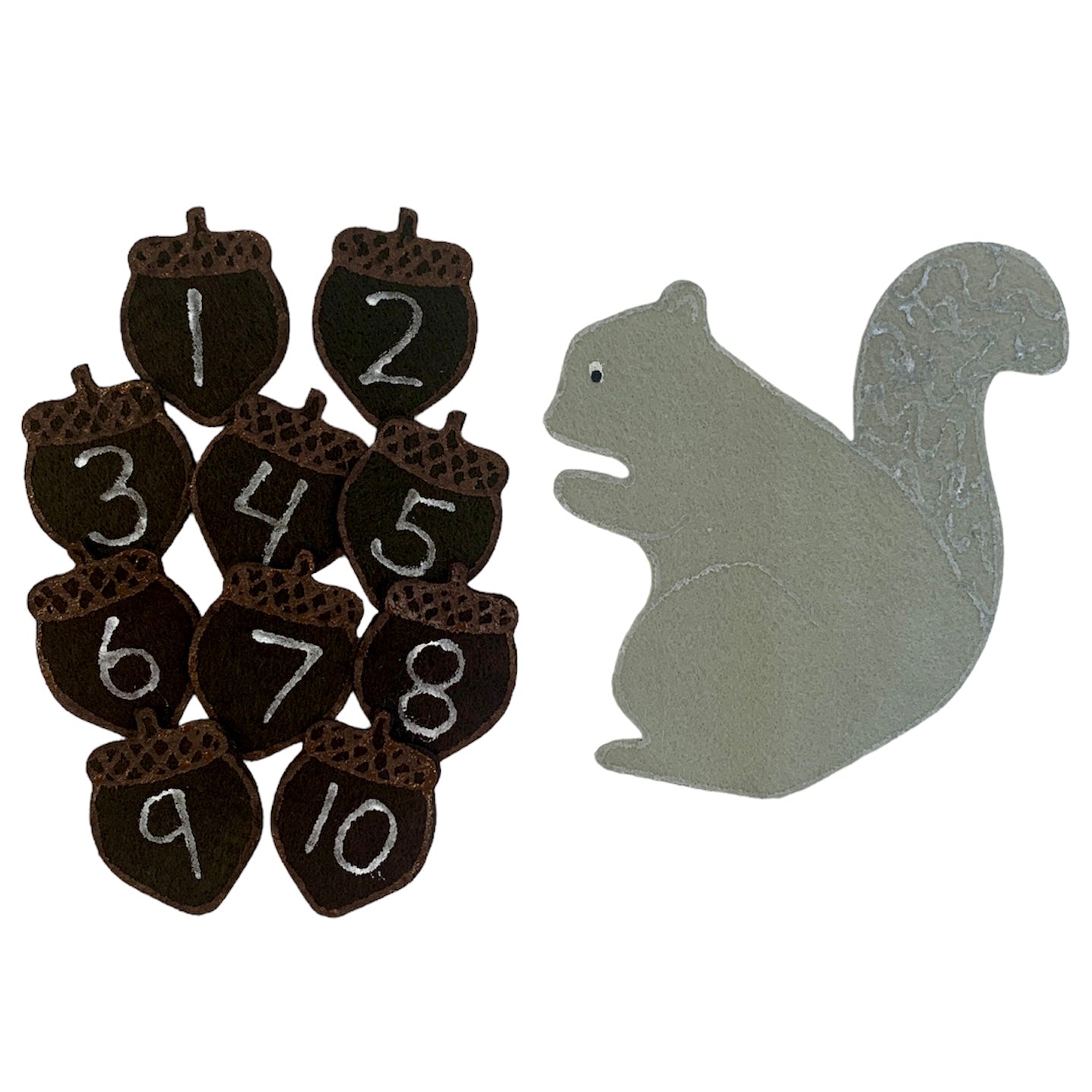 (Un écureuil Sammy et 10 glands étiquetés de 1 à 10.)