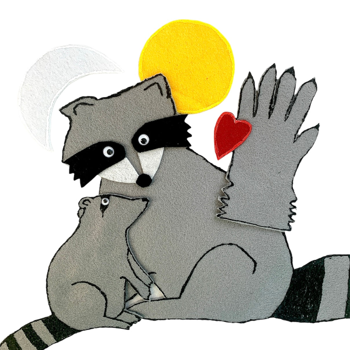 (Comprend une maman raton laveur, un bébé raton laveur, un soleil, une lune, un cœur et une main.)