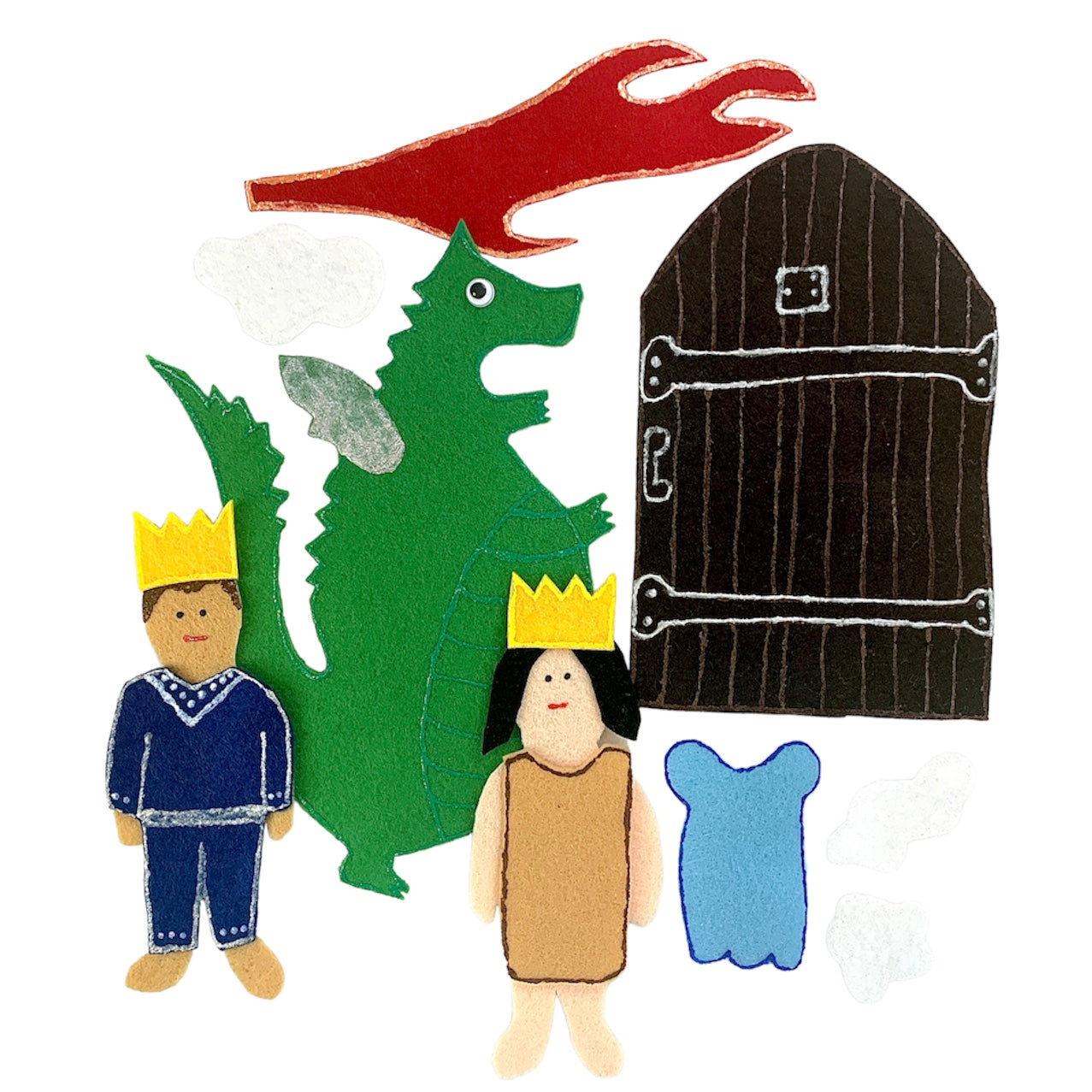 Comprend : Prince, Princesse avec robe en papier et robe bleue, dragon, feu, porte du château et trois bouffées de fumée !