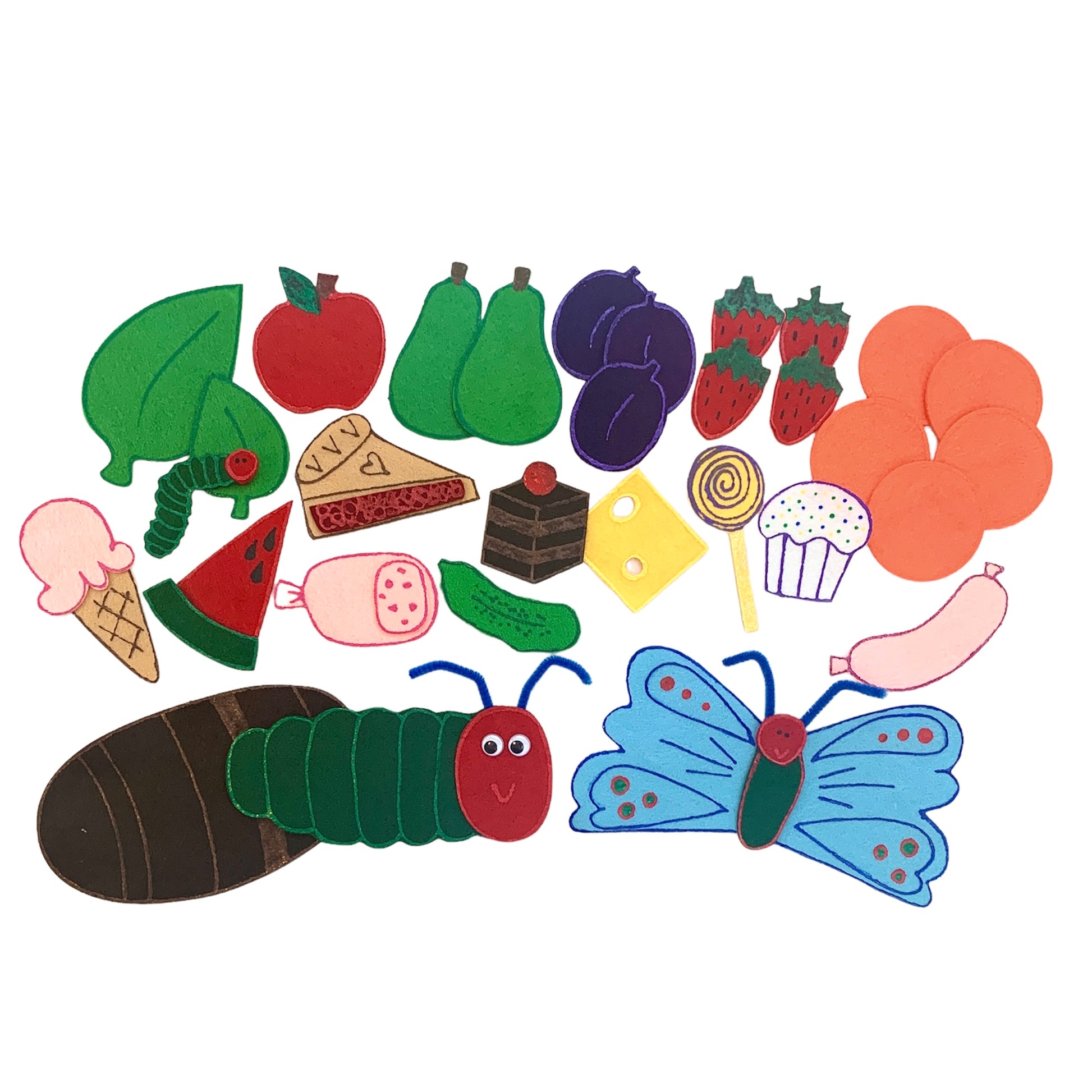 (Comprend un cocon, une grande chenille, une petite chenille, un cornet de glace, deux feuilles, une pomme, deux poires, un morceau de tarte, un morceau de pastèque, un jambon, un cornichon, un morceau de gâteau, 3 prunes. , une tranche de fromage, quatre fraises, une sucette, un cupcake, cinq oranges, une saucisse et un papillon !)