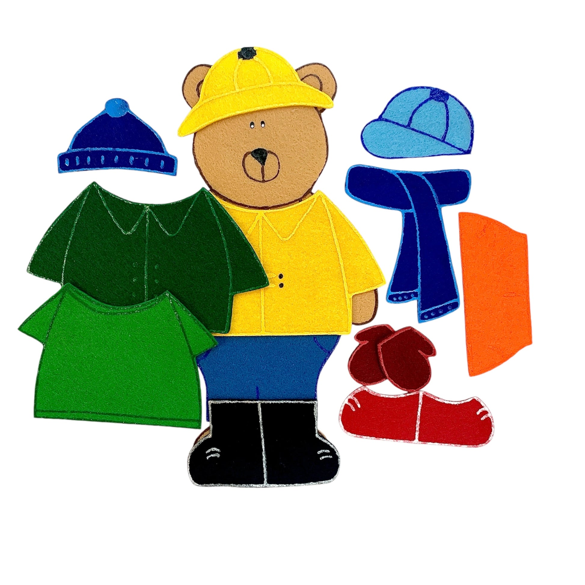 (Un ours, un imperméable, un chapeau de pluie, une tuque, une casquette, une écharpe, un short, un pantalon, une paire de mitaines, une paire d'espadrilles, une paire de bottes de pluie, une veste, et un t-shirt.)