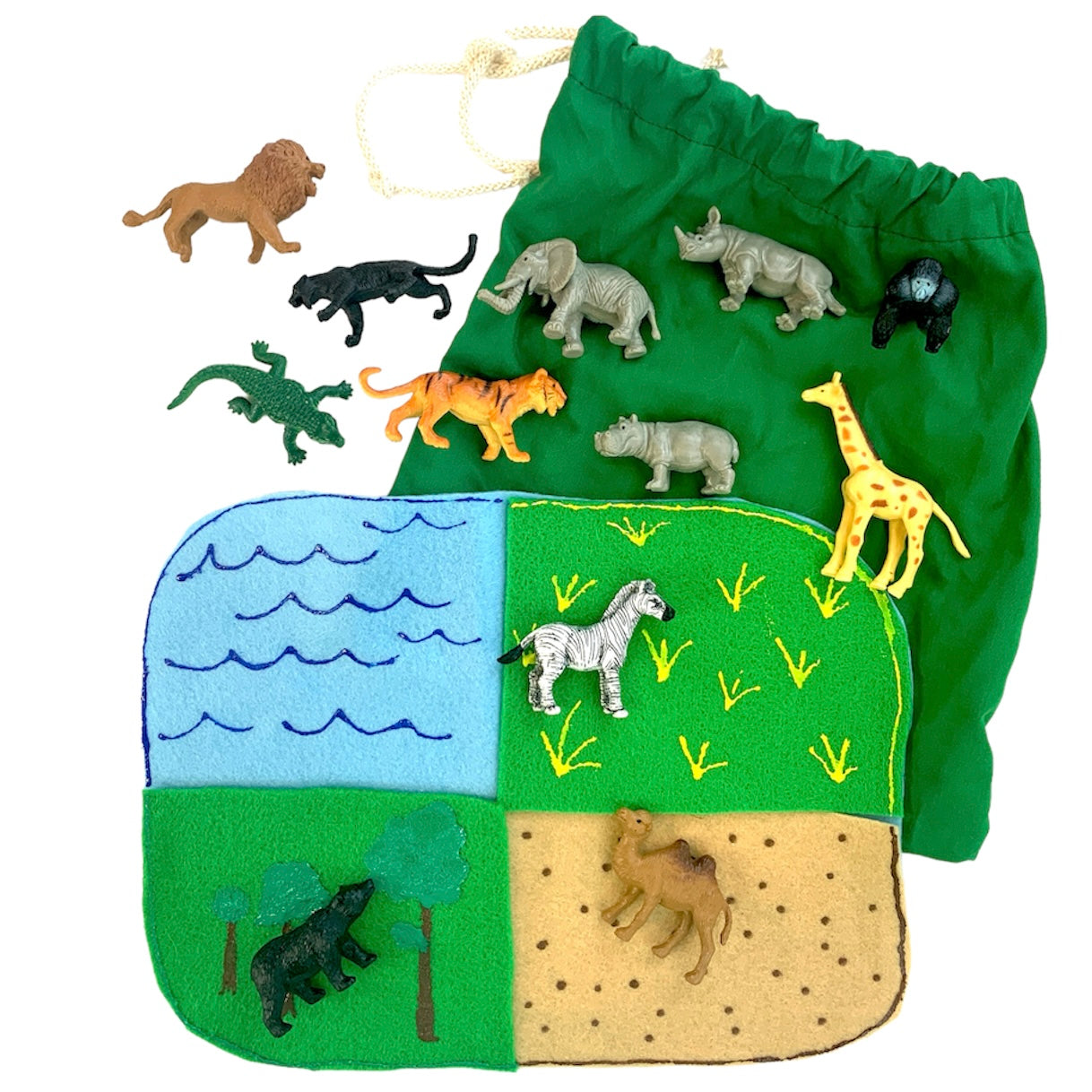 Le kit comprend un assortiment d'animaux sauvages et un tapis de jeu en feutre, tous conservés ensemble dans un sac à cordon.