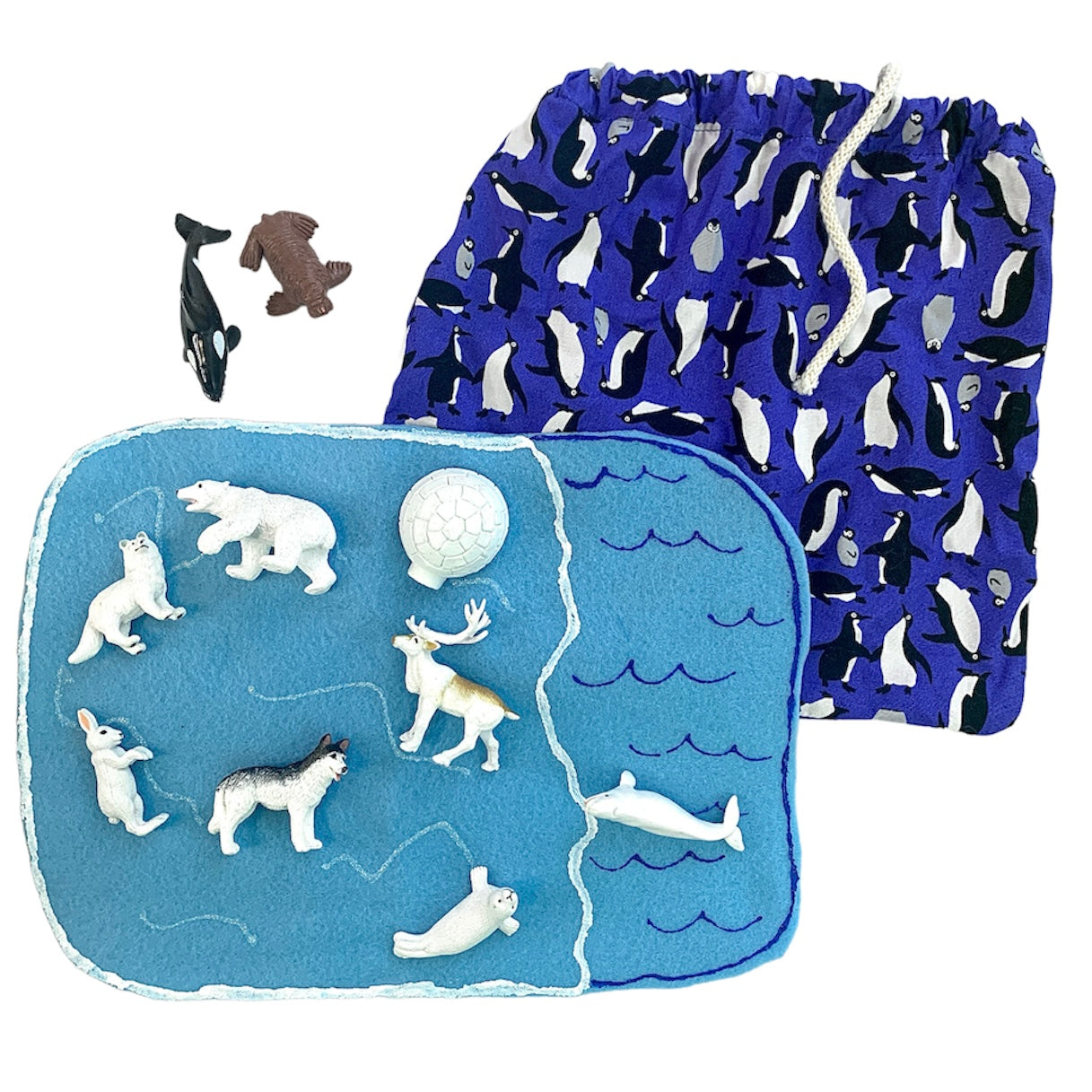Kit includes an assortment of seven arctic animals and a felt play mat that are all kept together in a drawstring bag.