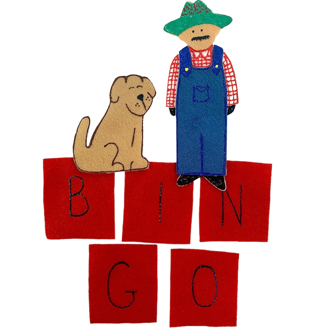(Includes, letters B I N G O, a farmer, and a dog.)