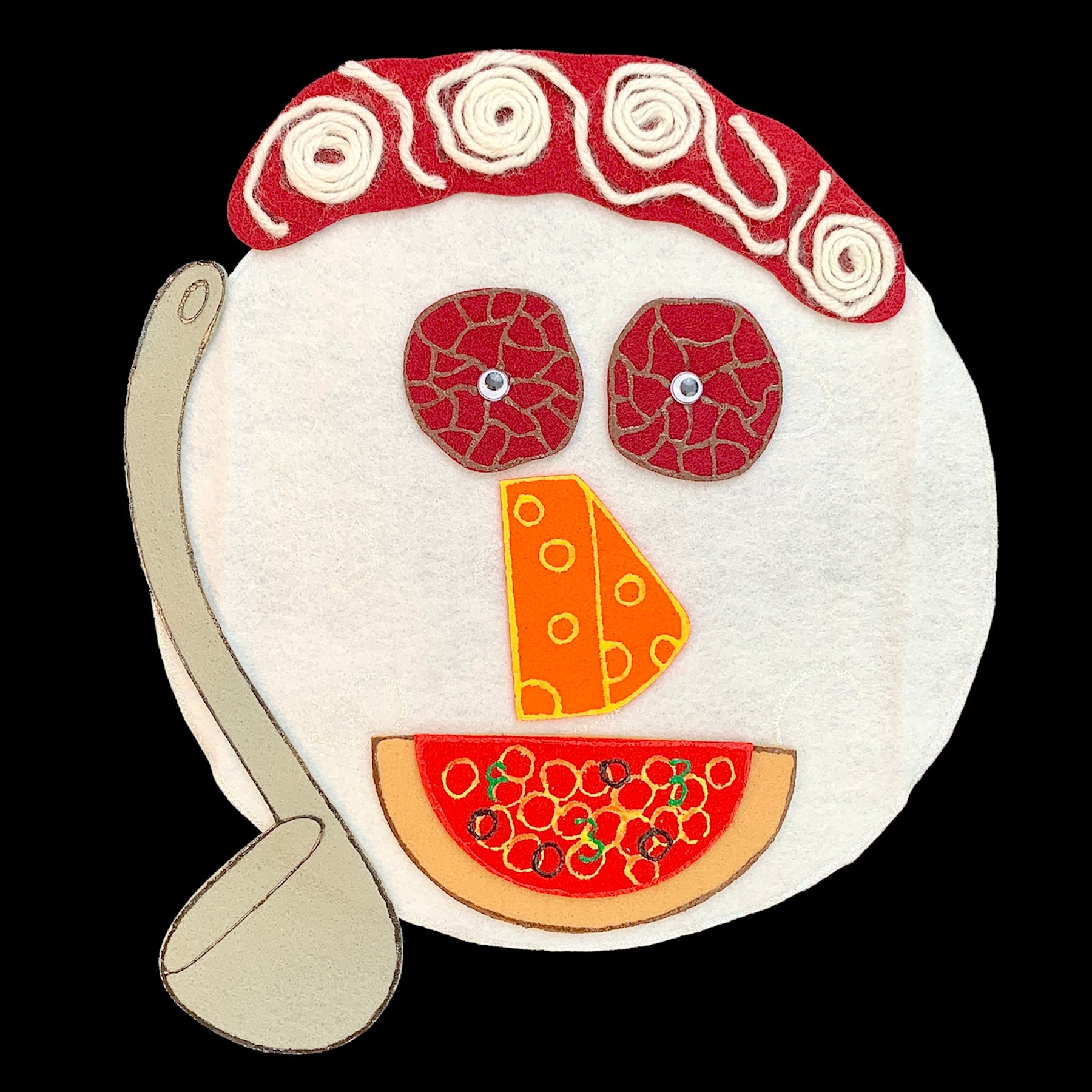 (One moon, one ladle, one hair made of spaghetti, two meatball eyes, one cheese nose, and one pizza mouth.)