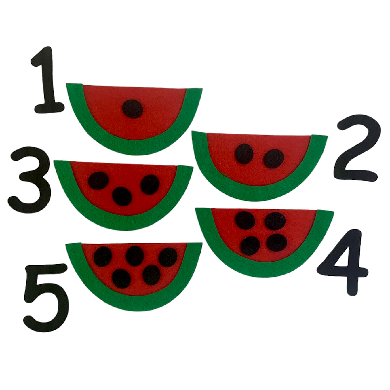 (Five watermelon slices with pit numbering 1-5, as well as numbers 1-5.)